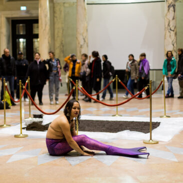 Ubicándose en frente de la Facultad de Ciencias de la Universidad Nacional Autónoma de México, Lía García llevó a cabo la acción Enciclopedia -2014-, título que hace referencia a aquellas rutinas en las que las corporalidades no normativas son aprehendidas no solo desde un conocimiento ajeno de aspiraciones universalistas sino también desde un sujeto normativo y poderoso de raíz eurocolonial. En efecto, en esta performance la sirena se encontraba enmarcada desde un dispositivo zoológico: estirada en el suelo de los alrededores de la facultad, la sirena se presentaba mediante una cartela taxonomizadora en la que se recogía información sobre la especie a la que pertenecía –«antropozoo», su nombre –«Gynaves Cantatrix»-, su hábitat –«Facultad de Ciencias»-, su distribución –«Mares»- y sus medidas –«1’73 metros»-.